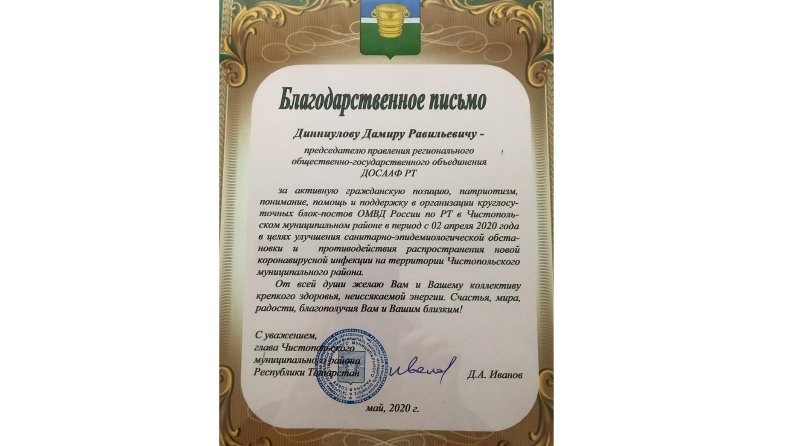 Глава Чистопольского района Республики Татарстан Дмитрий Иванов вручил Председателю Правления ДОСААФ РТ генерал-майору Дамиру Динниулову Благодарственное письмо за активную помощь в противодействии распространения короновирусной инфекции, за помощь в организации круглосуточных блокпостов в Чистопольском муниципальном районе в целях улучшения эпидемиологической обстановки, за активную гражданскую позицию и патриотизм.