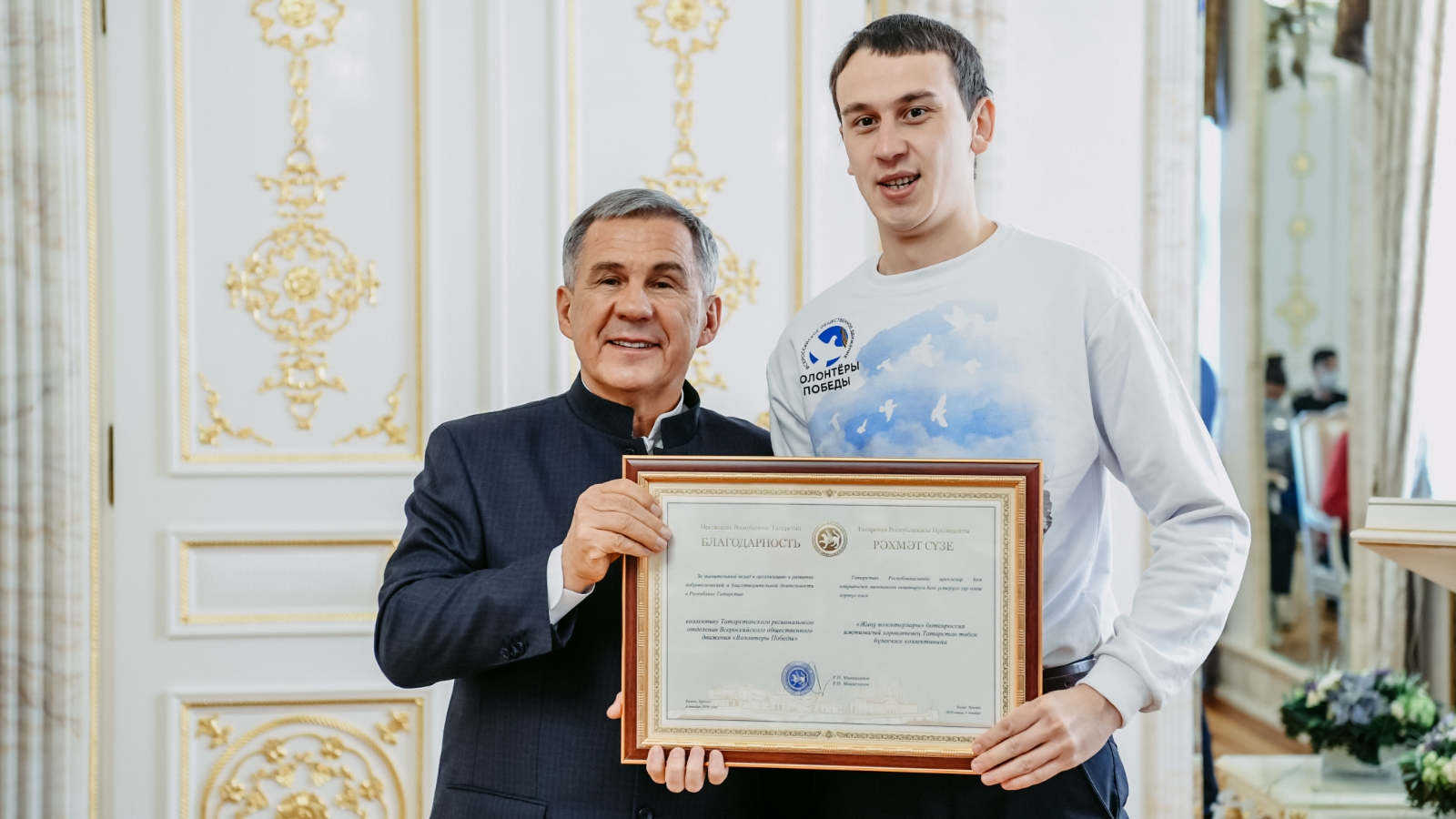Затем Рустам Минниханов вручил волонтёрам памятные медали Президента Российской Федерации и Благодарности Президента Республики Татарстан. В их числе и сотрудник правления ДОСААФ Республики Татарстан - и.о. начальника отдела патриотического воспитания и спорта Азат Идрисов.