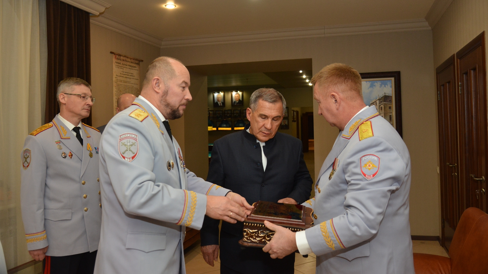 Председатель правления ДОСААФ РТ Дамир Динниулов передал Рустаму Минниханову подарок, привезенный из Сирии, от командующего группировкой войск Вооруженных Сил РФ генерал-лейтенанта Сергея Кузовлева.