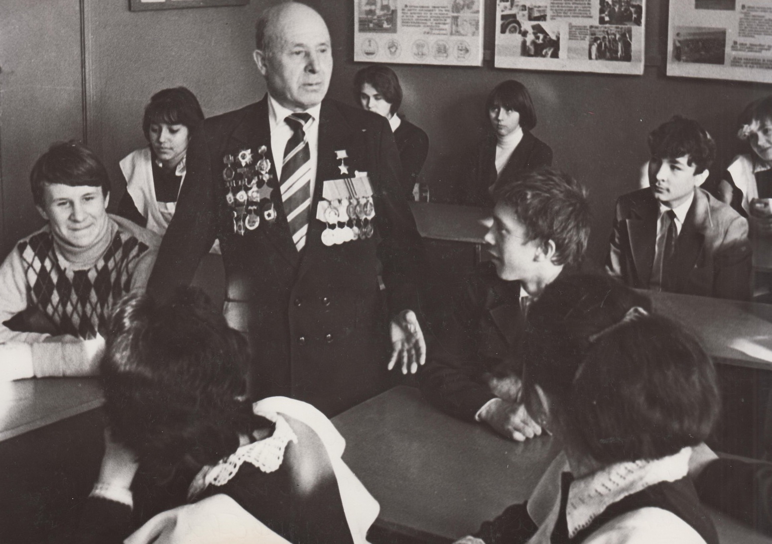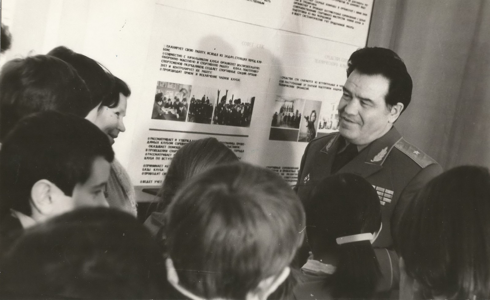 - Генерал Гайнулла Шарипович Шакиров проводит в ДОСААФ урок мужества для учащихся казанских школ, 10 декабря 1985 г.
