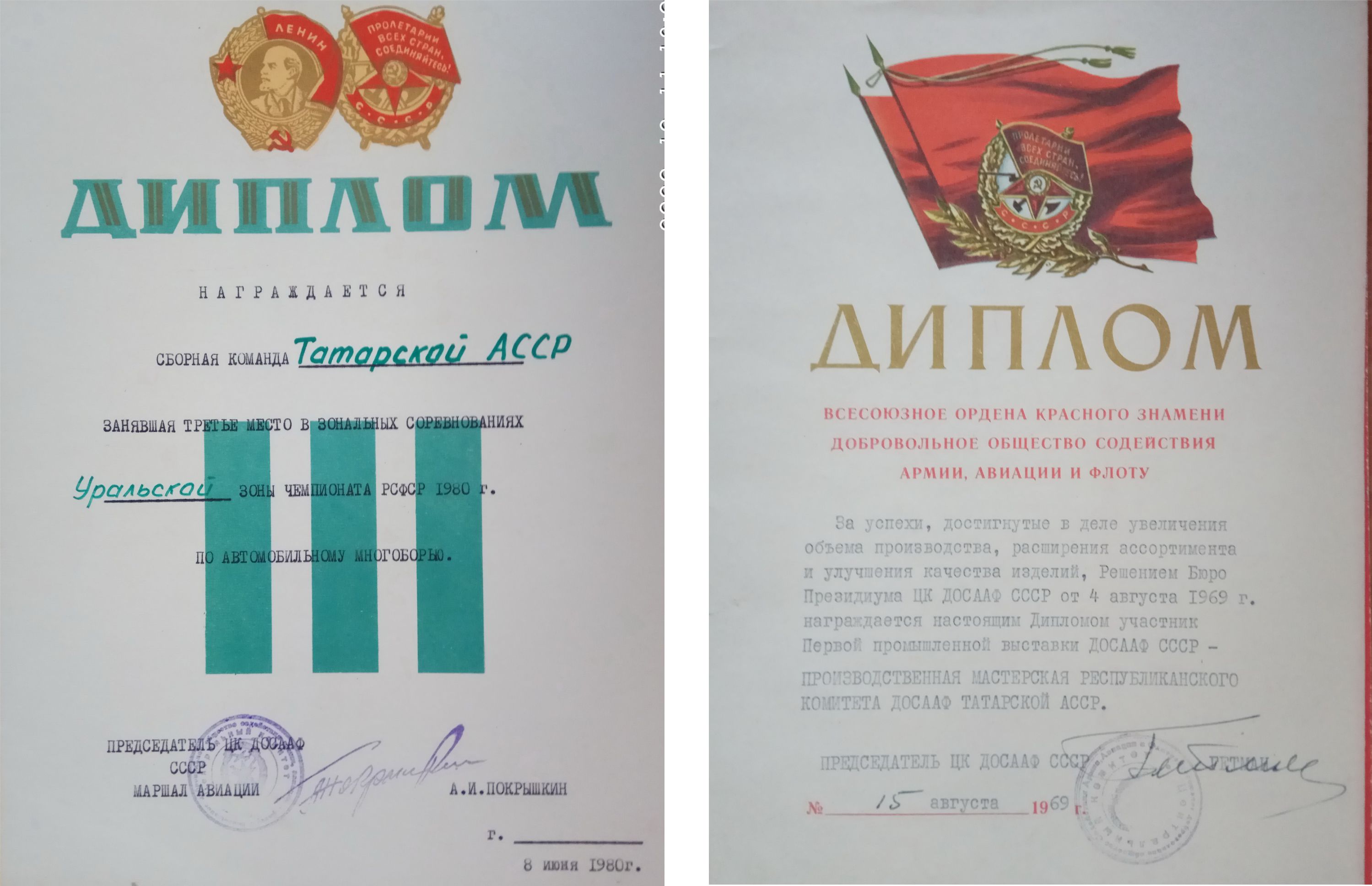 Так, например, сотрудники отдела кадров передали музею книги авторства легендарного руководителя Татарского обкома ДОСААФ генерала Гайнуллы Шариповича Шакирова. Экспонатами стали дипломы и грамоты, полученные оборонным обществом в разные годы за успехи в оборонной деятельности, спорте, патриотическом воспитании и другие заслуги. Среди них особенное место занимает Диплом третьей степени, врученный команде ТАССР на чемпионате РСФСР по автомобильному многоборью 1980 года, за личной подписью члена Президиума Верховного Совета СССР (в те годы), председателя ЦК ДОСААФ СССР, трижды Героя Советского Союза, маршала авиации Александра Ивановича Покрышкина. Уникален в историческом плане и Диплом ДОСААФ СССР, врученный производственной мастерской республиканского комитета ДОСААФ ТАССР в 1969 году председателем ЦК ДОСААФ СССР, Героем Советского Союза, генералом армии Андреем Лаврентьевичем Гетманом.