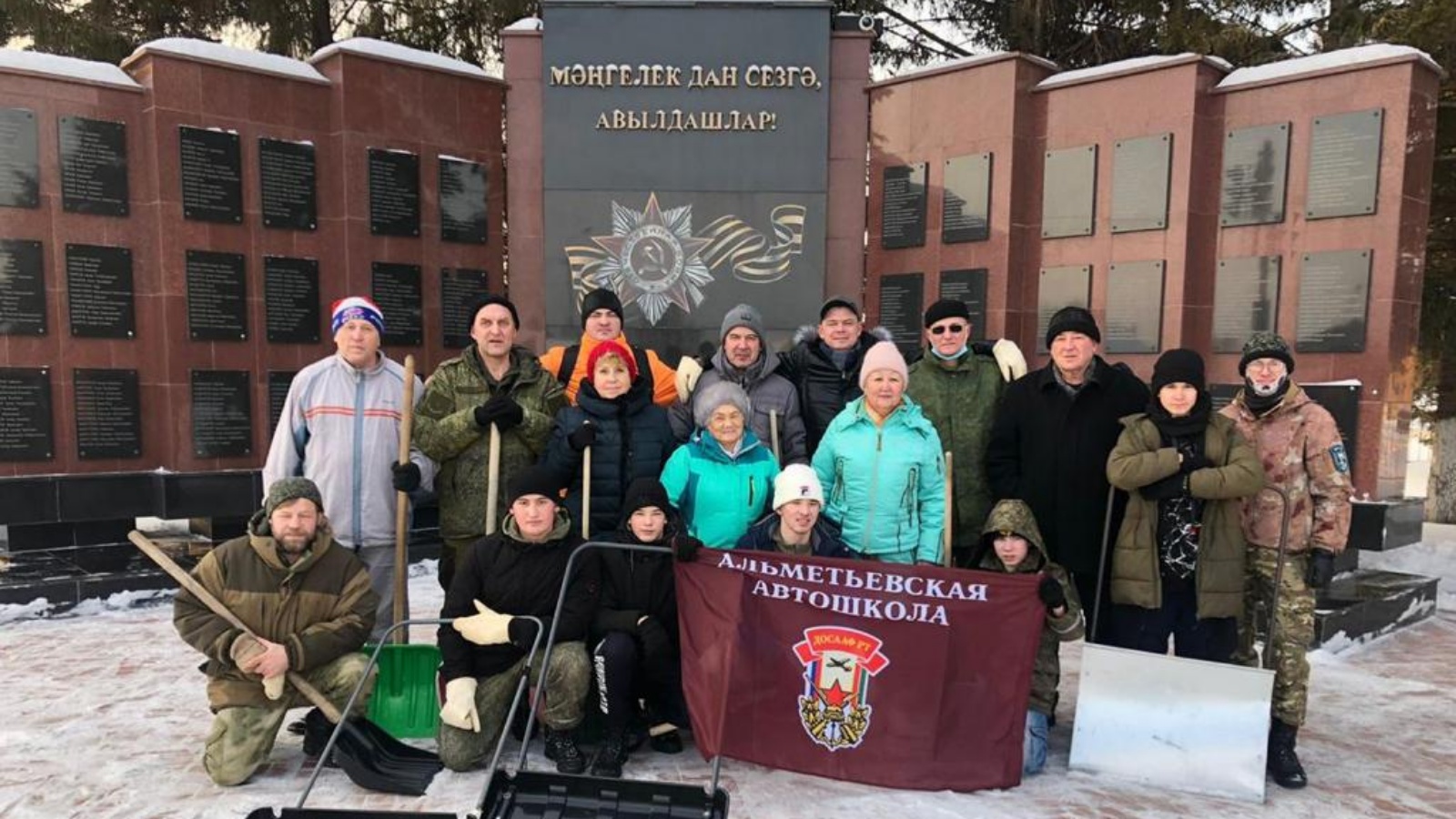 Сотрудники Автошколы Досааф г. Альметевск совместно с Советом Ветеранов и Казачеством города провели уборку снега на территории памятника солдатам,погибшим в Великой Отечественной войне.