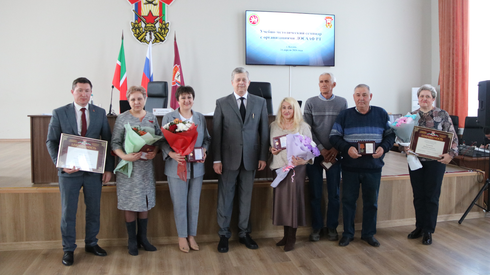 24 апреля 2026г. в стенах здания РОГО ДОСААФ Республики Татарстан прошёл учебно‑методический семинар с участием руководителей и бухгалтеров всех структурных подразделений. Мероприятие началось со вступительного слова председателя правления С.П. Старостина. Ознакомив всех присутствующих повесткой дня и регламентом семинара, он обозначил ряд вопросов, имеющих особую актуальность, и пояснил, почему их обсуждение критически важно для дальнейшего развития организаций. Перед заслушиванием докладов прошла торжественная церемония награждения участников, чьи заслуги в развитии образовательных программ и военно-патриотическом воспитании молодежи были особо отмечены руководством. Награды вручались лично председателем правления РОГО ДОСААФ РТ.